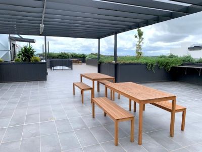 - Communal rooftop terrace with outdoor dining tables and BBQ facilities